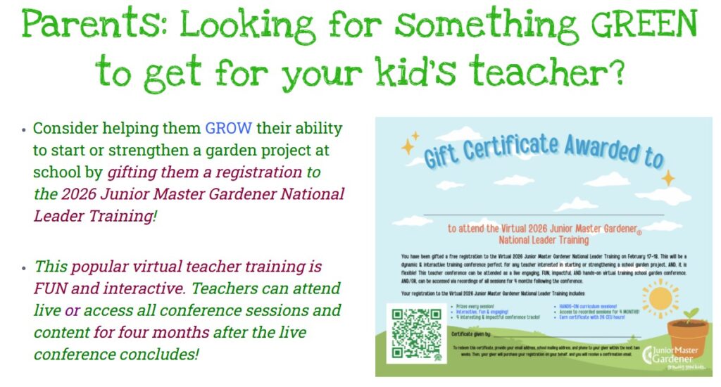 Junior Master Gardener curricula engages children in novel, “hands-on” group and individual learning experiences that promote a love of gardening, develop an appreciation for the environment, and cultivate the mind.